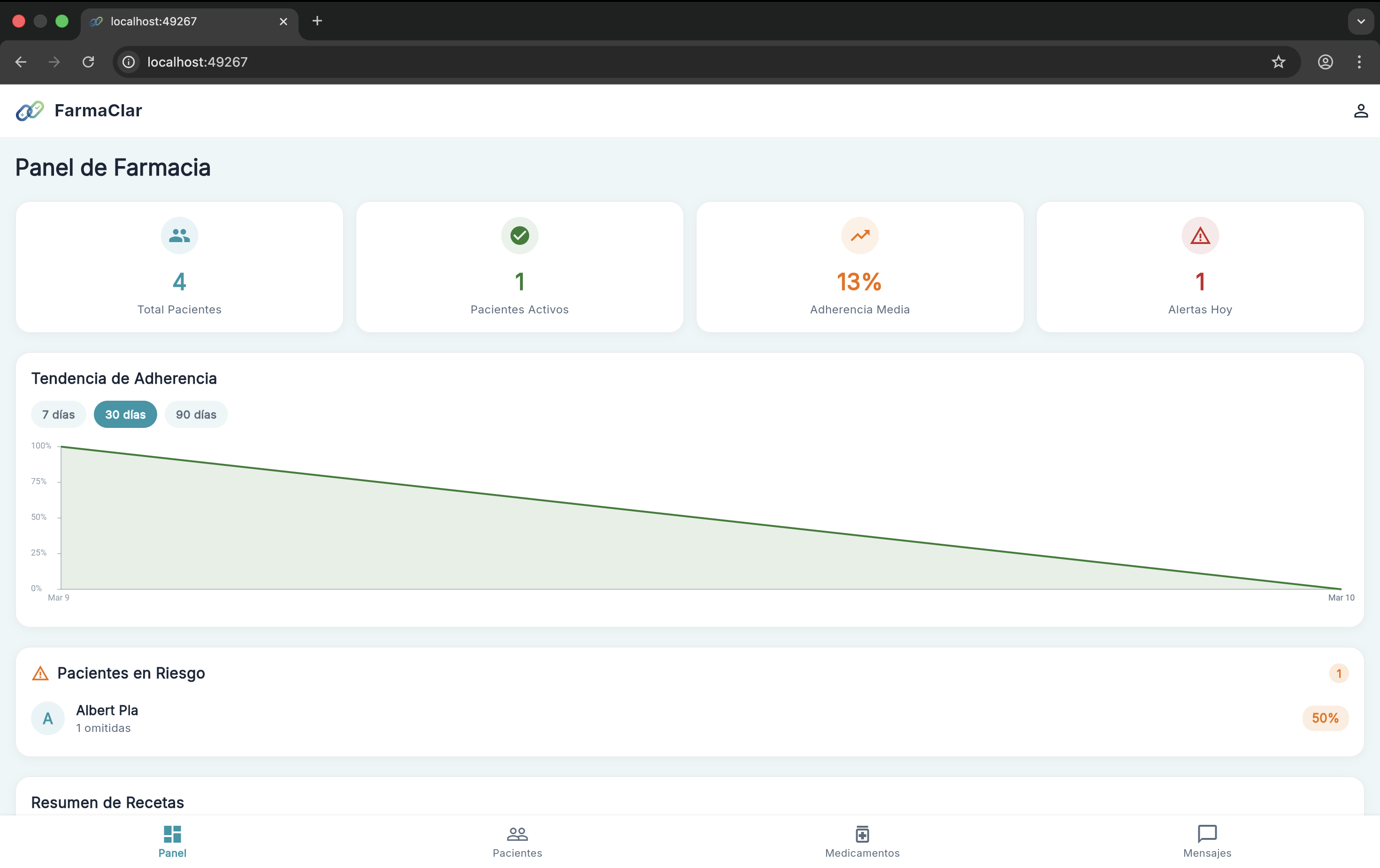 Plataforma integral de seguimiento de medicaci\u00f3n para farmacias comunitarias. Registro de tomas, prescripciones, bienestar del paciente y comunicaci\u00f3n directa en un solo panel.